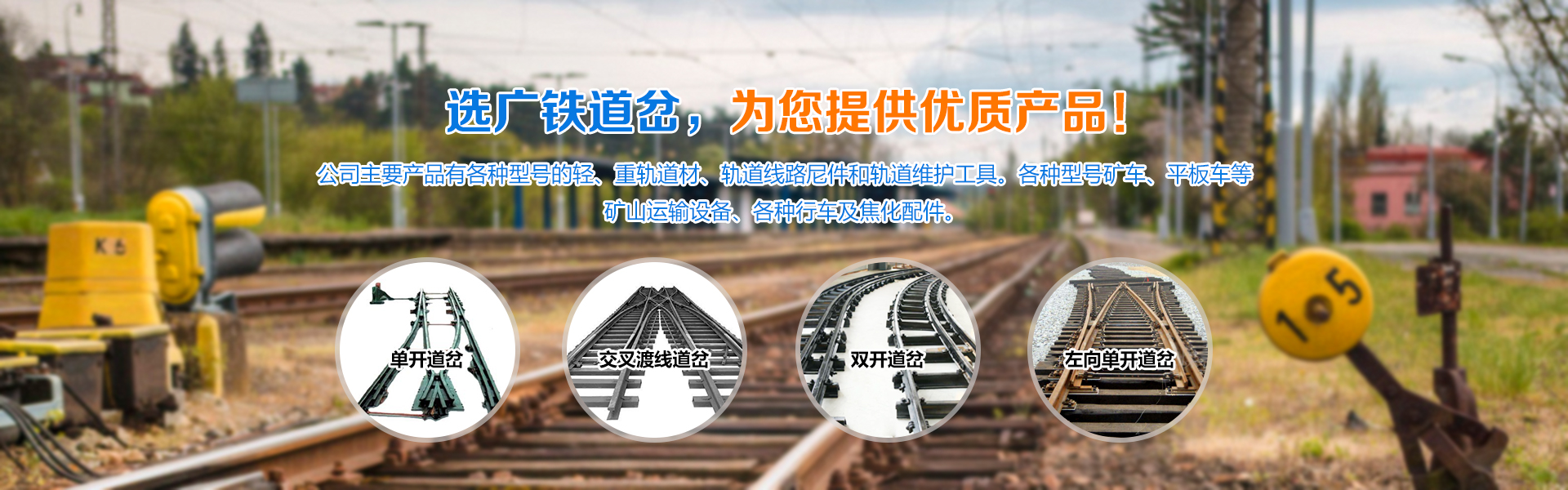 林州市廣鐵道岔有限公司擁有大型現代化高精生產設備及完善的質量檢測體系,產品完全符合國家質量檢測標準,滿足廣大客戶的需求。公司主要產品有各種型號的輕、重軌道材、軌道線路尼件和軌道維護工具。各種型號礦車、平板車等礦山運輸設備、各種行車及焦化配件。產品覆蓋3大系列200多個品種。為服務鐵路、冶金、煤炭郎實現鐵路道岔運輸標準化、現代化、自動化需求,實現鐵路道岔運輸標準化、現代化、自動化需要。